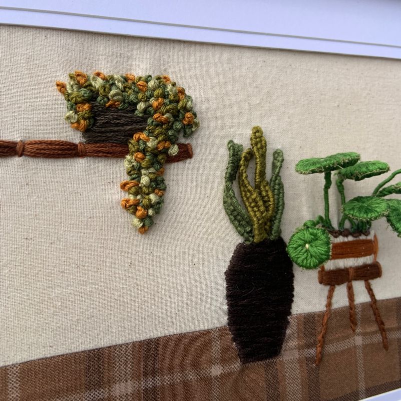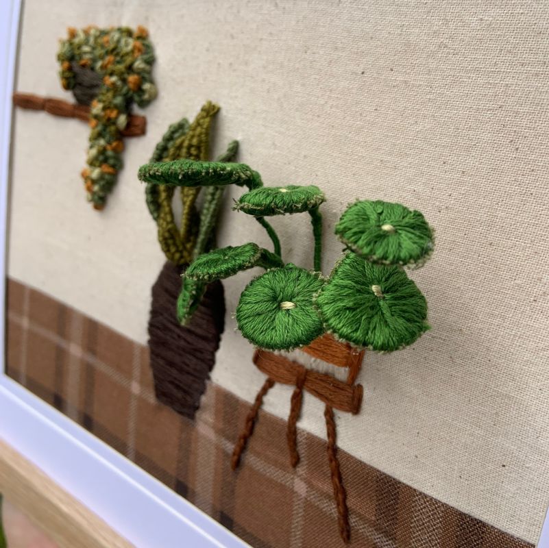 My work is influenced by nature, the quiet presence of houseplants in daily life, and the creativity I grew up with through my mum, who is also an artist. I create three-dimensional embroidery art inspired by houseplants and animals. Using thread, fabric, and wire, I shape leaves, greenery, and creatures into textured forms that feel full of life.