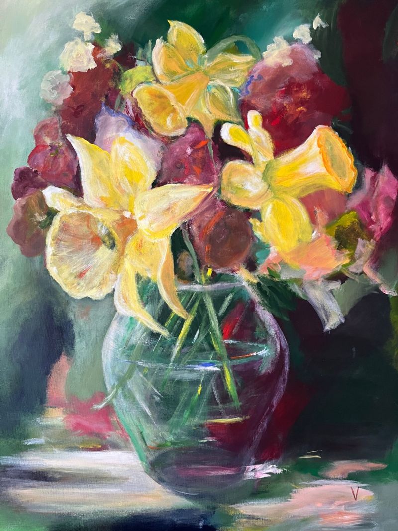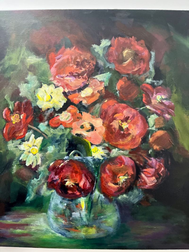The energy, bright colors and bold brush strokes used in her paintings is used to evoke a sense of contemplation and optimism.