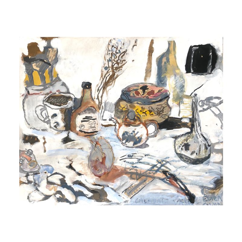 A Still life with studio art supplies mixed with ceramic objects and tableware from home