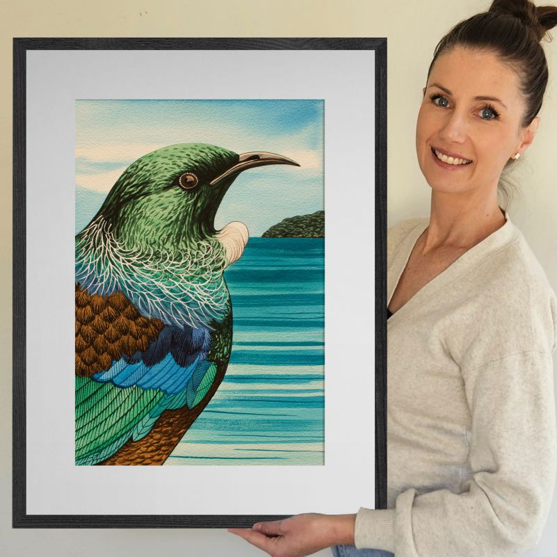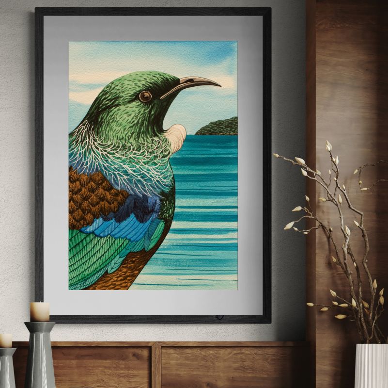 This striking close-up of a tūī invites the viewer into an intimate encounter with one of Aotearoa’s most iconic native birds. At first glance, the tūī is often perceived as black, but this painting challenges that illusion, revealing a dazzling array of iridescent colours in the plumage. The bird’s eye is a powerful focal point, sharp and intelligent, as it locks directly with the viewer, creating a sense of connection and presence. The gaze feels both inquisitive and watchful, as if the tūī is caught mid-thought. This work is a celebration of the unseen - the quiet intricacies that lie just beneath the surface, waiting to be noticed.