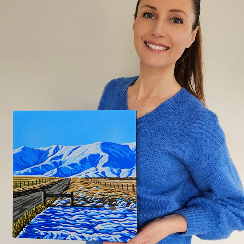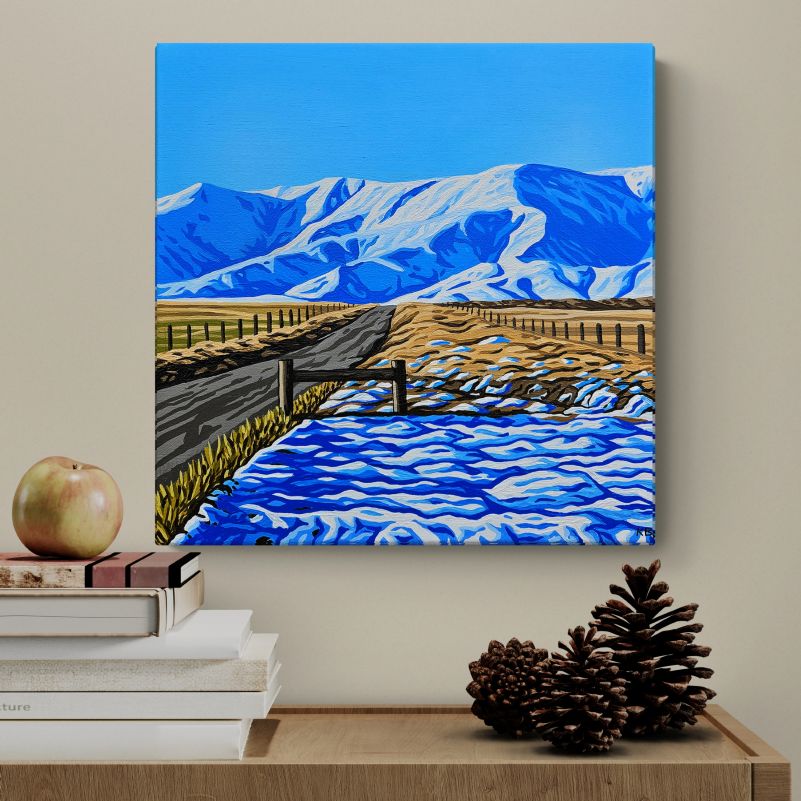 Bathed in the clear light of a crisp winter’s day, this painting captures the remote beauty of the snow-covered Hawkdun Ranges. The composition evokes that unmistakable moment of awe experienced on a road trip: when you turn a corner and are suddenly met with scenery so vast and striking, it feels like the world is revealing a secret. The sun illuminates the snowy ranges, casting icy blue shadows that contrast sharply with dazzling white, creating a play of light and texture across the scene. With its cloudless sky, and vivid clarity, the work speaks to a profound stillness and isolation, yet also the exhilaration of discovery. It is a celebration of place, of silence, and of the emotional charge that the raw, open landscapes of Central Otago can inspire.